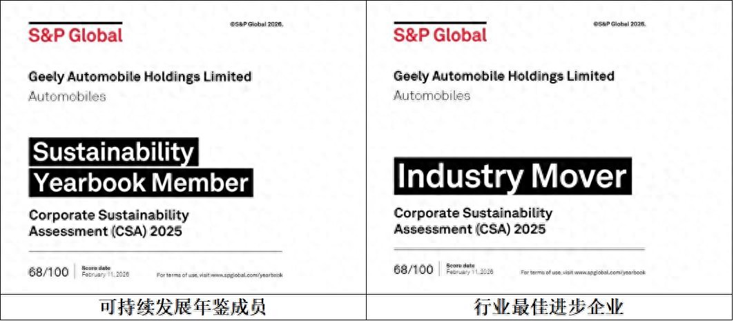 2月18日,国际权威评级机构标普全球(S&P Global)正式发布《全球可持续发展年鉴 2026》(Global Sustainability Yearbook 2026),以下简称“《年鉴》(全球版)”。吉利汽车控股有限公司(0175.HK)凭借在环境、社会和公司治理(ESG)的卓越表现,在标普全球企业可持续发展评估(CSA)中成绩强势突破,从78家参评的全球汽车制造商中脱颖而出。首次被选入《年鉴》(全球版)即跻身全球仅8家入选的汽车制造商中唯一中国车企,实现了历史性突破。