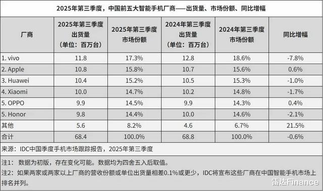 根据IDC研究数据,今年第三季度,vivo手机以17.3%的市场份额位居榜首,单季出货量达1180万台,较去年同期下降7.8%;苹果手机的市场份额为15.8%,出货量为1080万台,屈居vivo之后;华为则以15.2%的市场份额位居第三,小米紧随其后,市场份额为14.7%。
