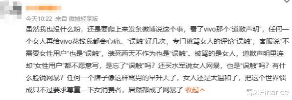 然而,公司的声明却未能平息舆论风波。有网友认为,vivo道歉声明不及时,且十分敷衍,质疑其“专挑骂女人的评论”“误触”好几次。