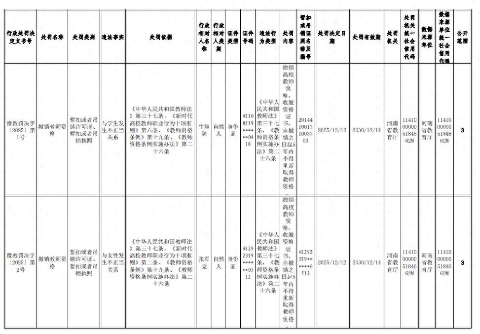 2025年12月31日,河南省教育厅发布“2025年撤销高校教师资格行政处罚” 的通报。通报对五名教师做出了撤销或丧失教师资格的处理。