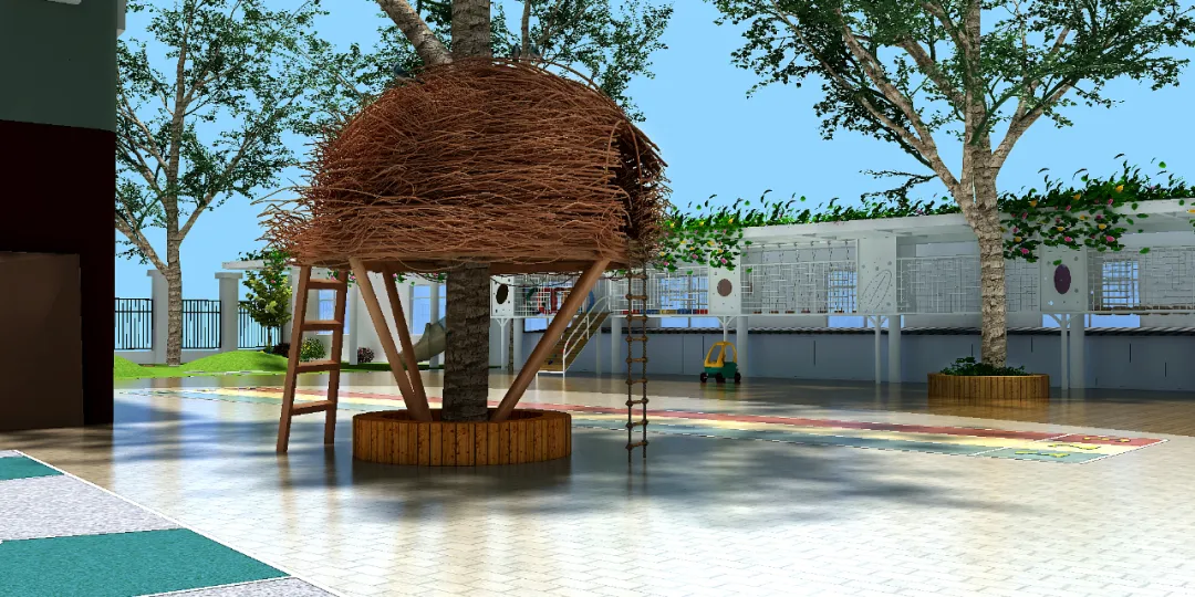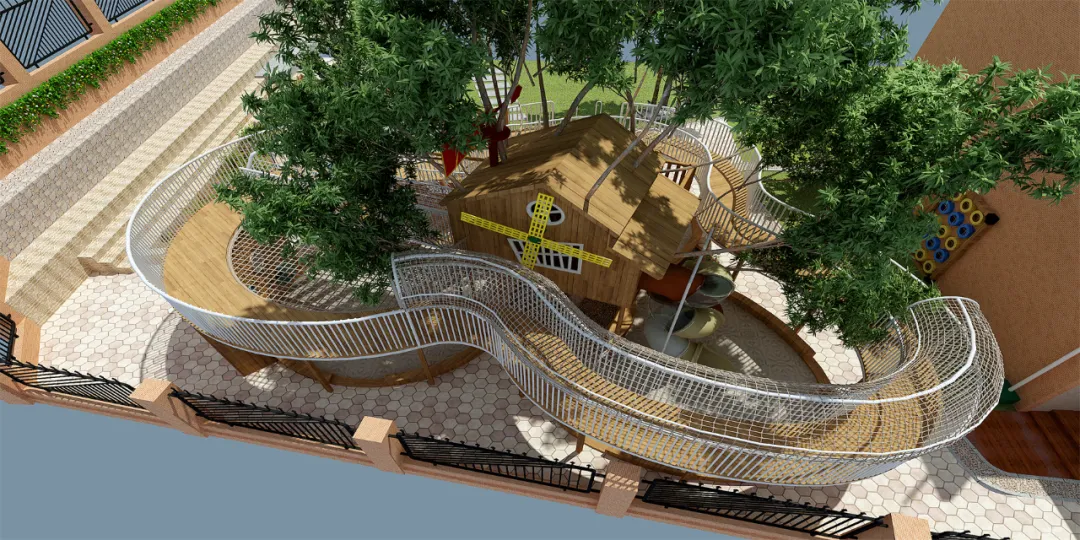 在这个案例中,我们为树屋融入了更多色彩。鲜艳的红、青翠的绿色……为小朋友们带来的感官冲击更强烈。