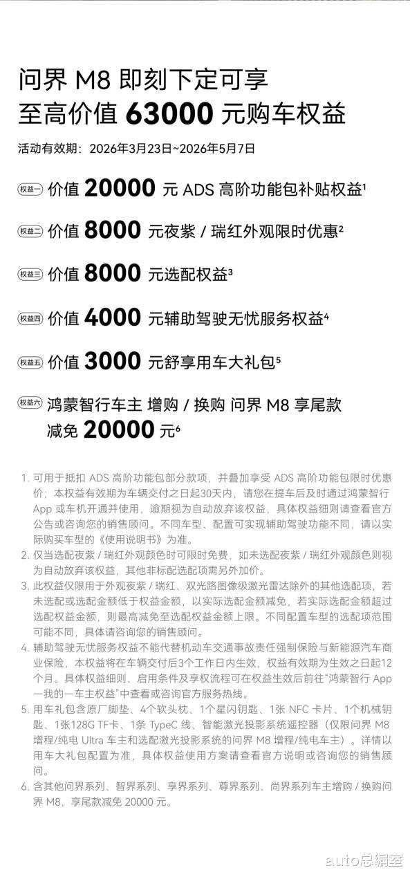 为让用户轻松拥享智慧豪华体验,问界M8推出多重权益,即日起至2026年5月7日下定,即可享受至高价值63000元购车权益,包括价值20000元ADS高阶功能包补贴权益、价值8000元夜紫/瑞红外观限时优惠、价值8000元选配权益、价值4000元辅助驾驶无忧服务权益,以及价值3000元舒享用车大礼包,同时鸿蒙智行车主增购或换购问界M8享尾款减免20000元,多重礼遇一步到位。