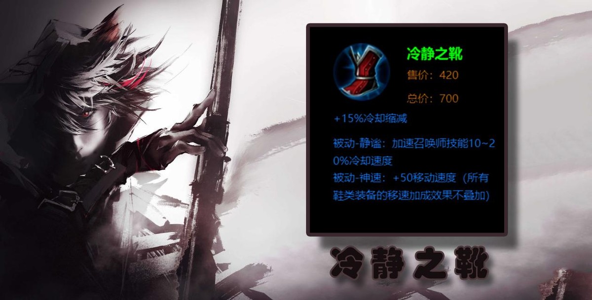 冷静之靴是一件属性很单一的鞋子,不提供任何防御属性,只是提供+15%的冷却缩减。当然这缩减不单单指英雄技能,还能为召唤师技能提供+10-20%冷却缩减,以及+50移速。