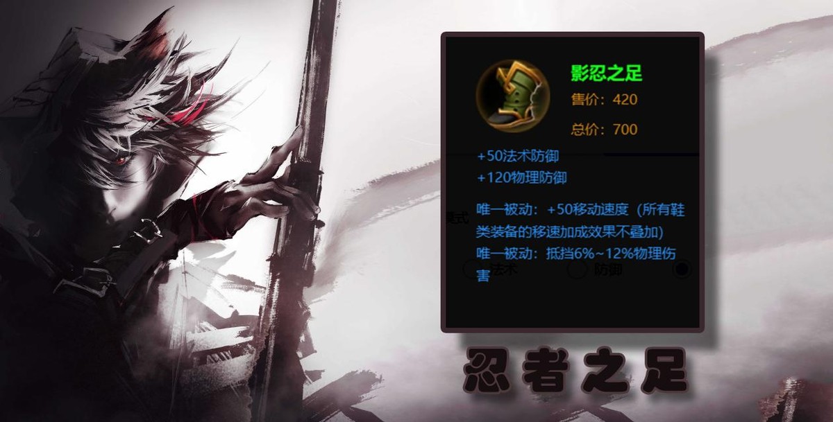 影者之足也是大家常说的布甲鞋,属于独一档的存在。可以为英雄提供+120物防、50法防、以及+50移速,更有减少6%-12%物理伤害。