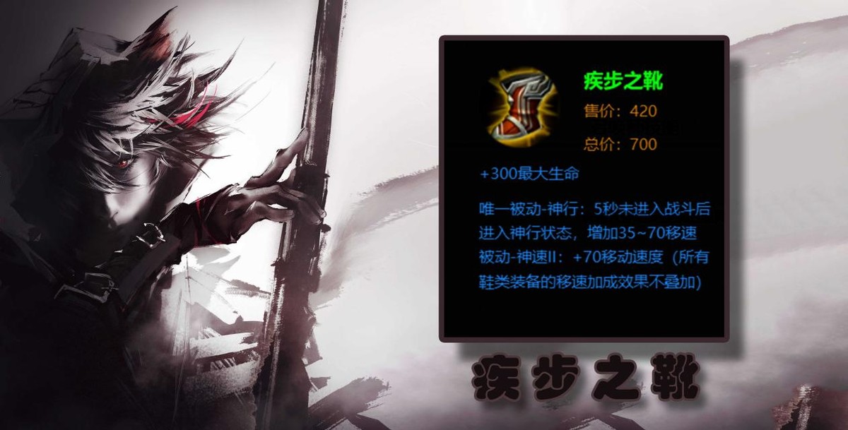 疾步之靴首先我们来先看面板属性,+300点血量,+70基础移速,5秒未进入战斗额外增加35-70移速。