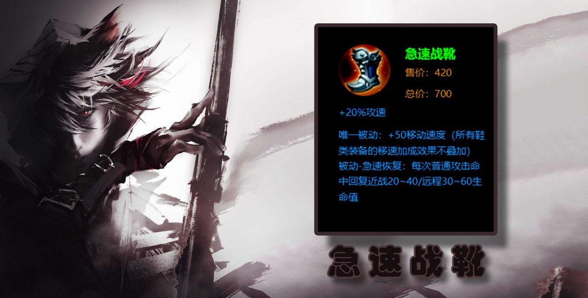 急速战靴提供50点基础移速,+20%攻速,每次普攻额外回复生命值。