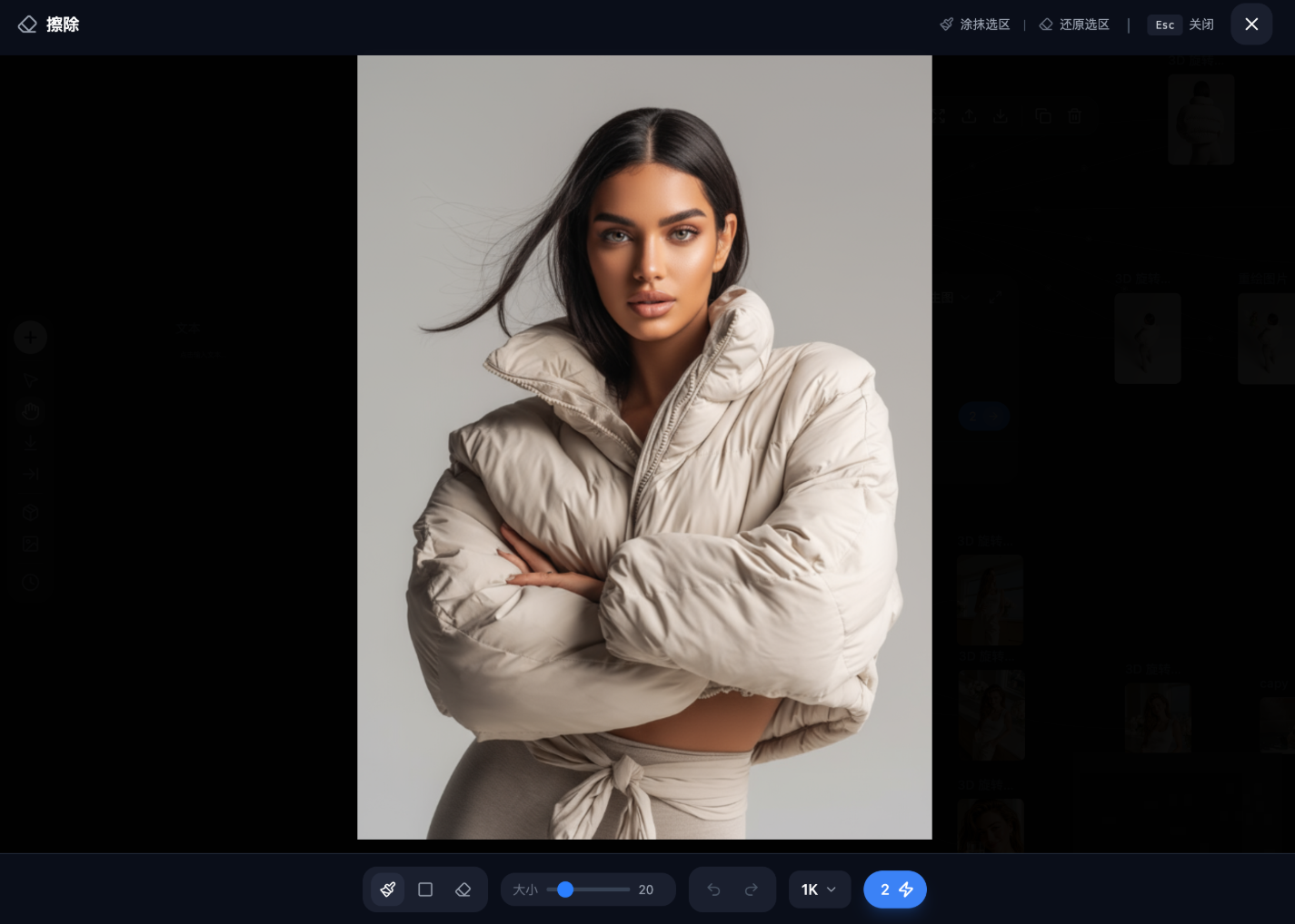 功能简介擦除功能让你可以轻松移除图片中不需要的元素——多余的人物、杂物、水印、瑕疵……只需涂抹想要去除的区域,AI会自动识别并用合理的背景填充,无需重新生成整张图片。