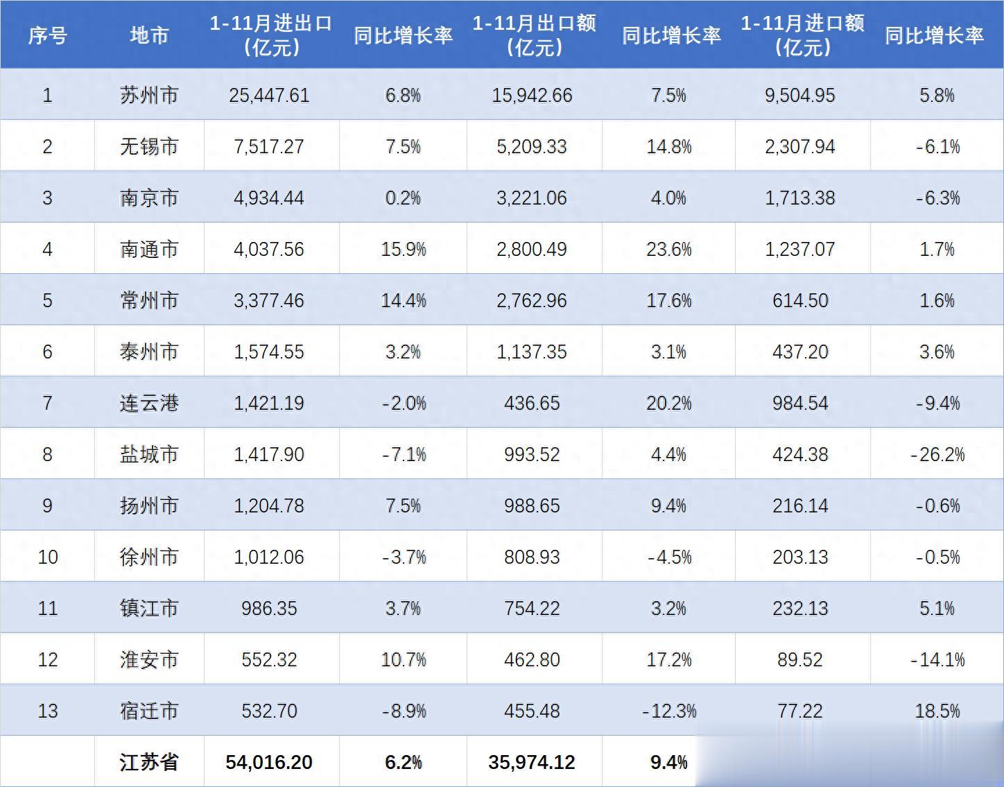 江苏省是我国经济实力位居前二的省份,其进出口贸易总额也常年仅次广东。根据统计部门公布的数据,2025年1-11月份,江苏全省共完成进出口总额54016.20亿元,较上年同期增长6.2%。其中出口总额达到了35974.12亿元,同比增长9.4%;进口总额则为18042.08亿元,同比基本持平。