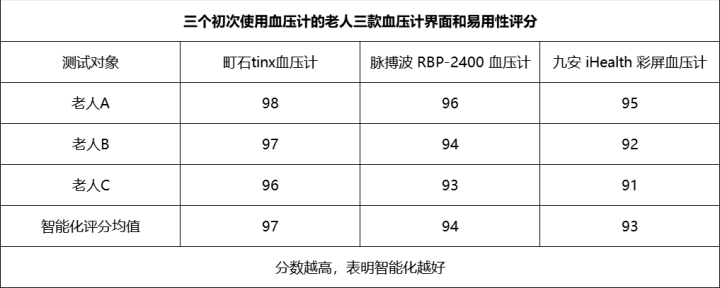 测评方法:找3名之前没有用过血压计的老人分别使用这三款血压计,测量过程中观察每款设备的功能是否智能,并对智能化进行打分。