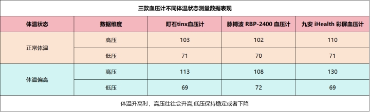 测评方法:分别在体温正常和偏高的情况下用这三款血压计进行测量,然后观察对应高压、低压数据表现。