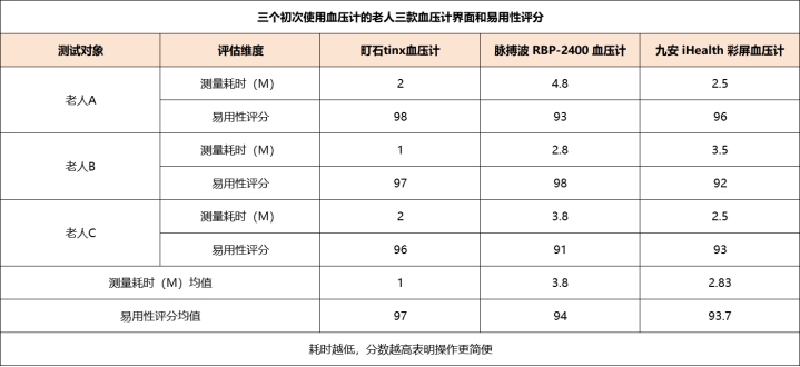 测评方法:找3名之前没有用过血压计的老人分别使用这三款血压计,记录每个人每款设备从启动到测量完成所耗费的时间,并让每个人对每款设备的易用性进行打分。