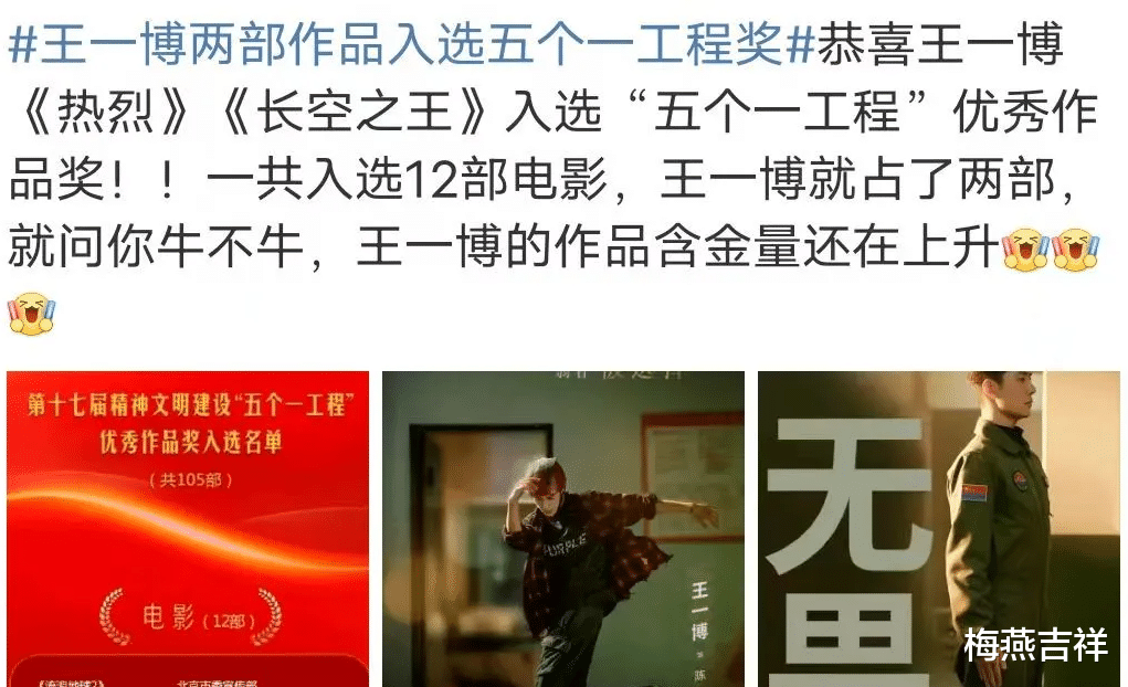 这不,大清早王一博就上了热搜,他的两部作品《热烈》和《长空之王》入选了第十七届精神文明建设“五个一工程”优秀作品奖,简直太赞了!