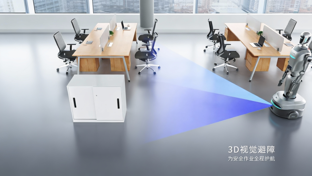 搭载自研3D视觉避障传感器,智能检测悬空、低矮障碍物,实时感知环境动态,主动避障绕行,为安全作业全程护航。