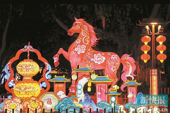 位于灯会1号大门的“星河驰骋·骏马腾云”灯组,以代表大湾区“9+2”城市的11匹骏马和市花为起点,传递对湾区“祥瑞常伴、蓬勃发展、文化共兴”的美好期许。