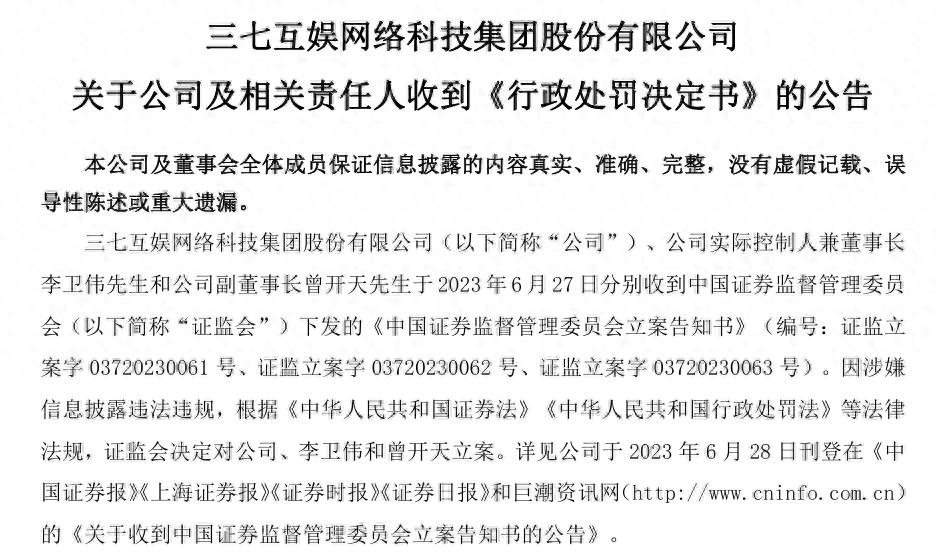 12月5日,三七互娱(证券代码:002555)发布公告称,因涉嫌信息披露违法违规,公司及相关责任人收到中国证监会下发的《行政处罚决定书》。