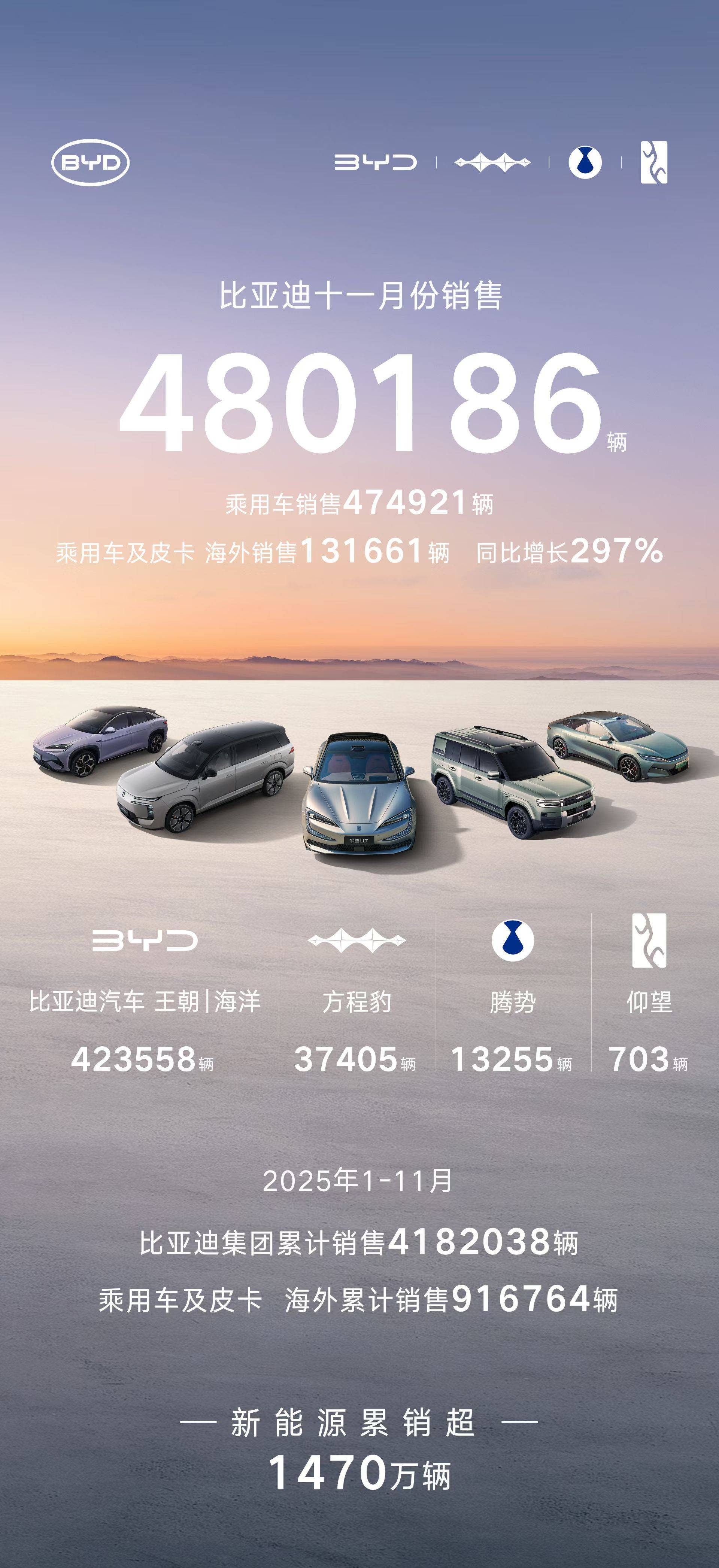 不只是在欧洲,比亚迪整个海外市场都势头强劲。2025年1-11月,比亚迪在海外累计销量已经突破91万辆,仅11月单月就卖了超过13万辆,同比增长297%。截至目前,比亚迪全球新能源汽车累计销量已超过1470万辆。