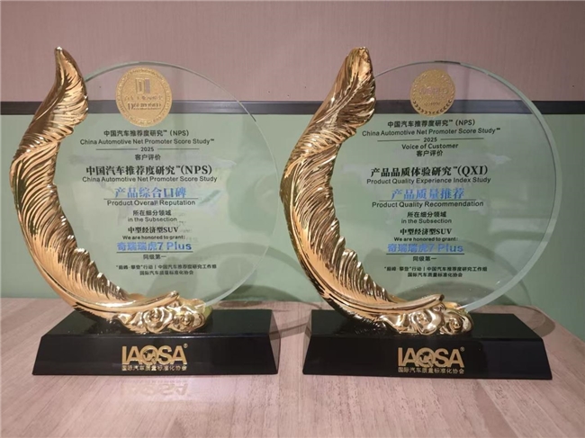 此次在IAQSA中国汽车推荐度研究中,瑞虎7 PLUS斩获中型经济型燃油SUV细分市场“产品质量推荐第一”与“产品综合口碑第一”两项殊荣,正是用户真实体验的最佳印证。未来,奇瑞将持续以技术创新与严苛品控,为全球用户打造超越期待的驾乘体验,让“中国智造”在全球舞台持续闪耀。