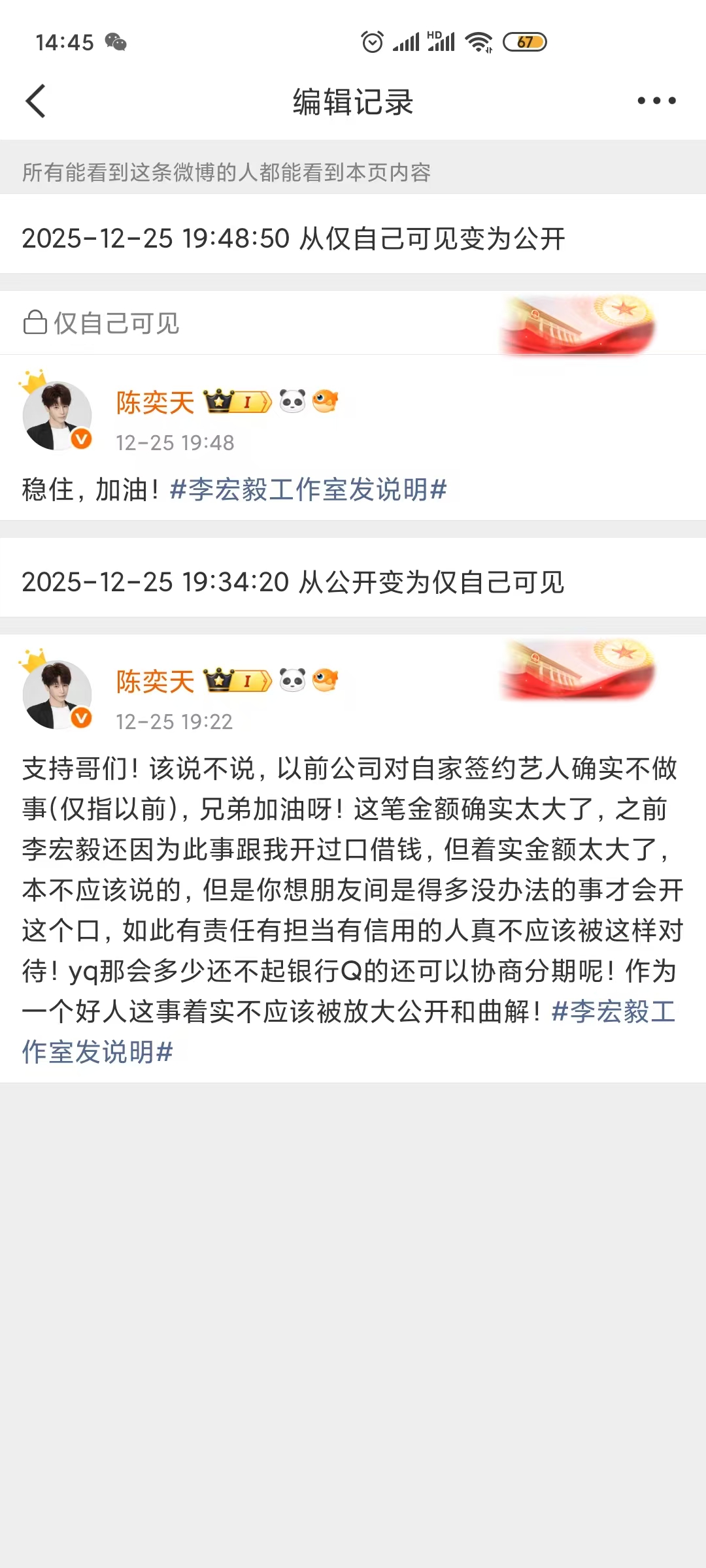 小编还发现,其实李宏毅和陈奕天发布的微博都编辑过,小编查看了编辑历史才发现,李宏毅编辑过的和现在的没有任何区别,倒是陈奕天,编辑前的内容满满干货!他说到李宏毅是有负责有信用有担当的一个人,不应该被放大且曲解,虽然小编不知道为何编辑了,但是却能看出陈奕天和李宏毅的友谊之牢。