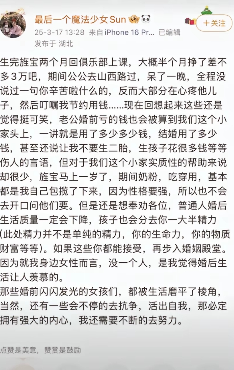 因为她还在微博里控诉了邓钧一家人的恶行,比如她生完孩子2个月就回去工作了,半个月赚了3万块钱,期间公公来家里教育她不要乱花钱,不要生二胎,因为养孩子费钱,说自己儿子赚钱不容易之类的话。