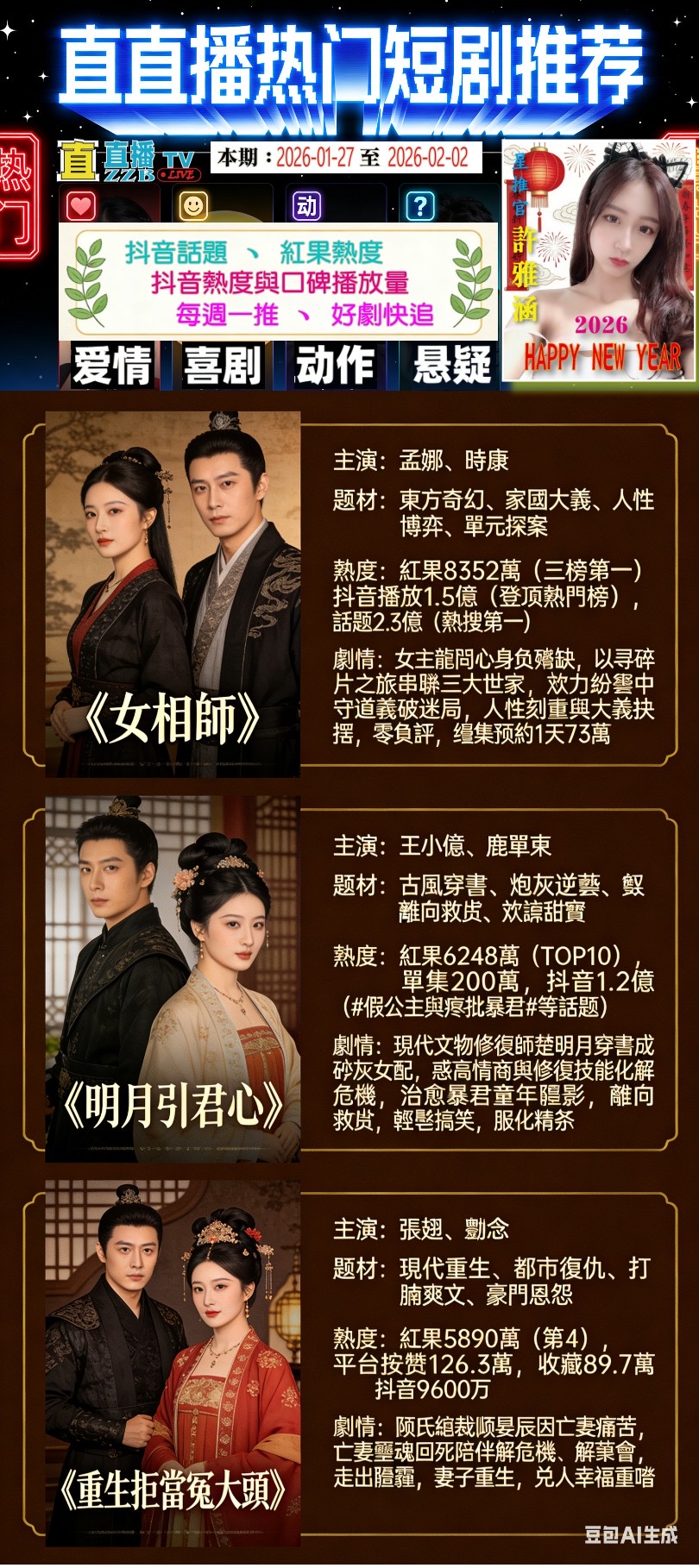 2026年01月27日至2026年02月02日抖音热度与口碑双优的3 部热门短剧,数据基于红果热度、播放量及抖音话题传播,适配短视频用户快节奏追剧需求: