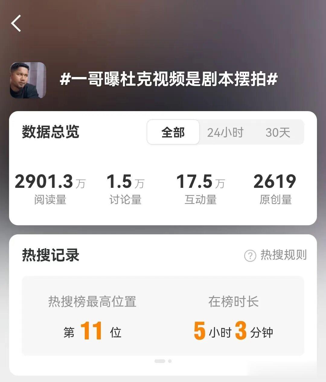 这一爆料让杜克陷入了舆论漩涡中,“一哥曝杜克视频是剧本摆拍”“杜克 一哥”等词条还冲上微博热搜,引发多方讨论。