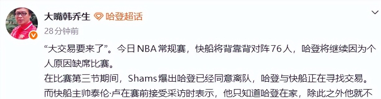 名记Shams也爆出,快船和哈登本人已经接受这个事情,双方正在寻找彼此感兴趣的球队。