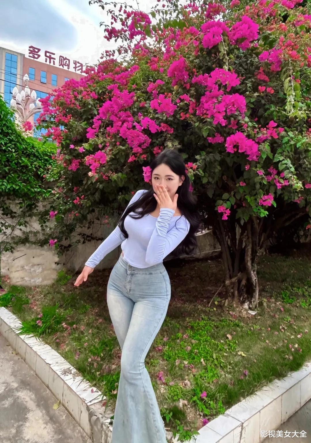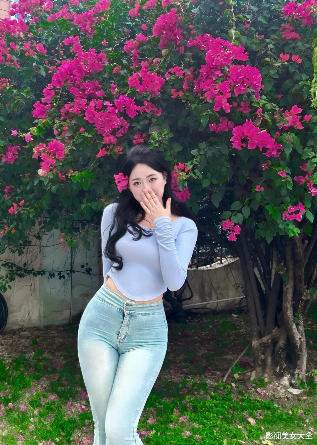 在开得好看的花丛旁边,把两只脚交叉站着,身体可以稍微往花的方向倾斜一点。然后抬起一只手,轻轻捂在嘴边,自然地笑出来,不用笑得太大声,那种浅浅的笑容就很好。这样的拍照动作放在公园场景里,能和周围的花呼应起来,拍出来特别好看。