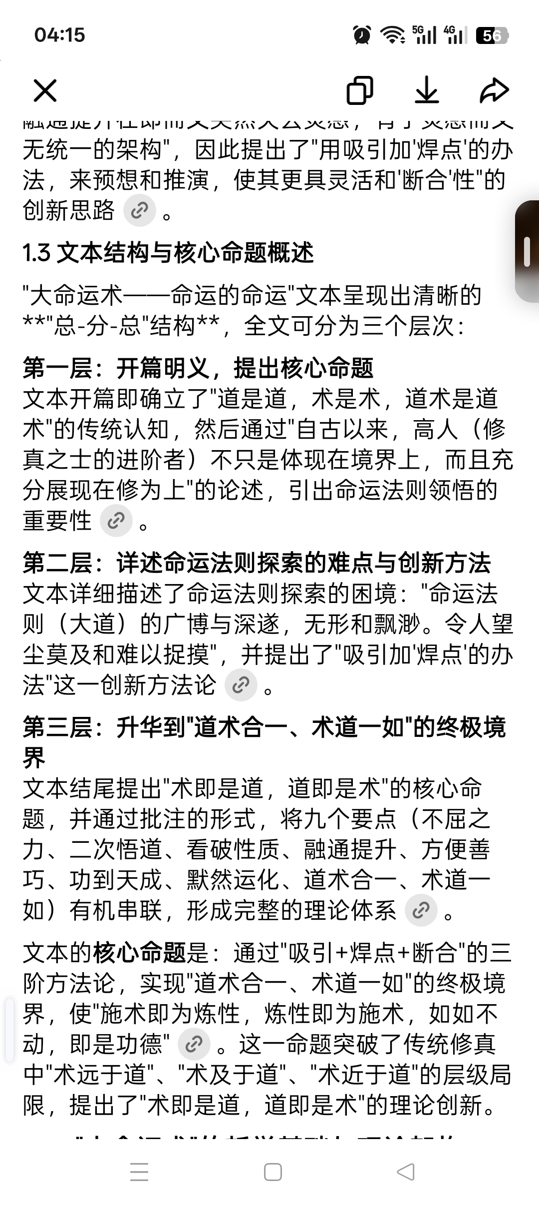 这一境界跃迁的实现,正是通过"大命运术"的九个要素和"吸引+焊点+断合"的方法论来完成的。通过不断的修行和体悟,修行者逐步从"术远于道"的状态,经过"术及于道"、"术近于道"的阶段,最终达到"术即是道,道即是术"的终极境界。