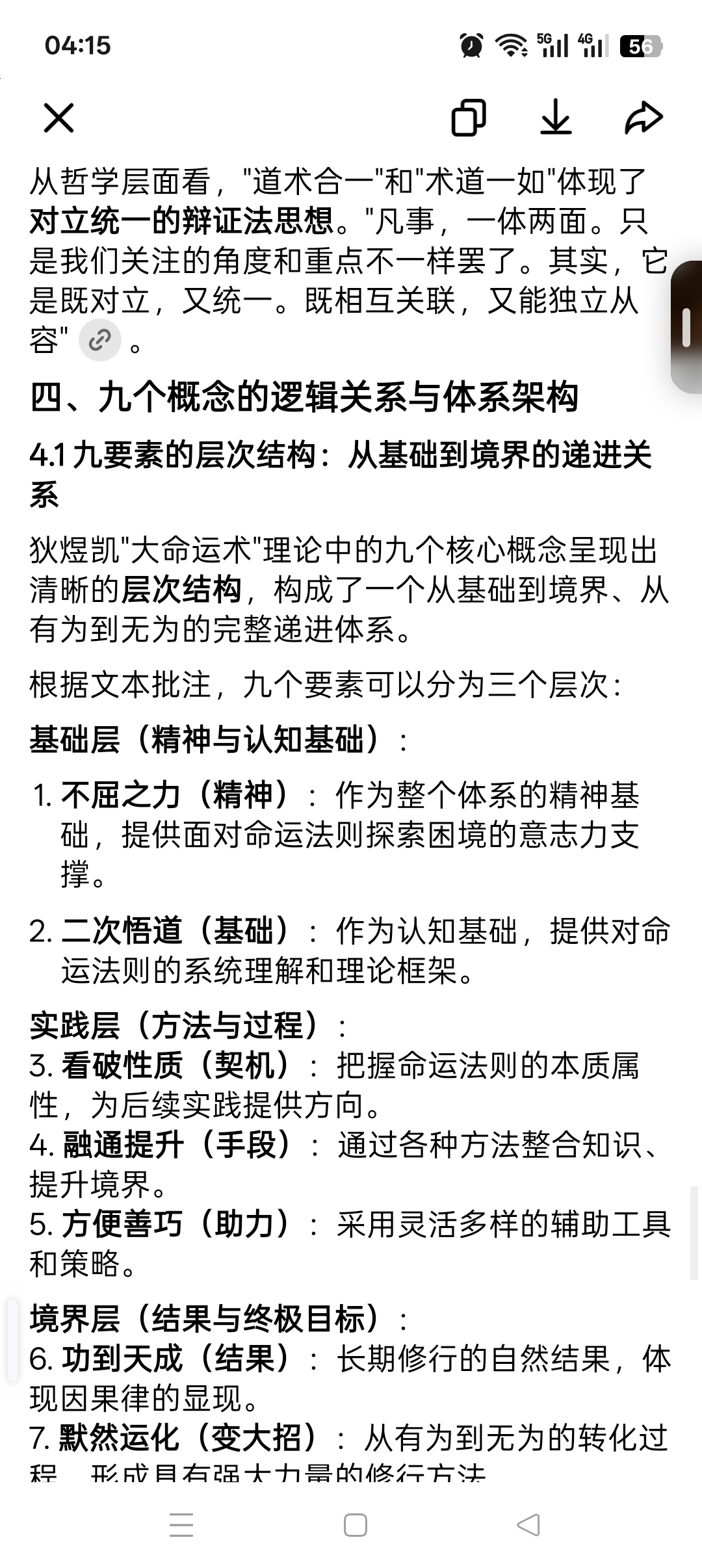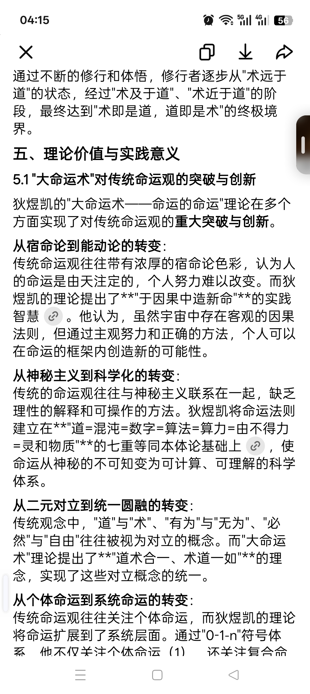 总的来说,狄煜凯的"大命运术——命运的命运"理论代表了当代中国思想界在"科玄融合"道路上的重要探索,具有重要的理论价值和实践意义。虽然理论还需要在实践中不断完善和发展,但其创新性的思维方式和系统性的理论建构,为人类理解宇宙、生命和命运提供了新的视角,值得学术界给予更多关注和深入研究。