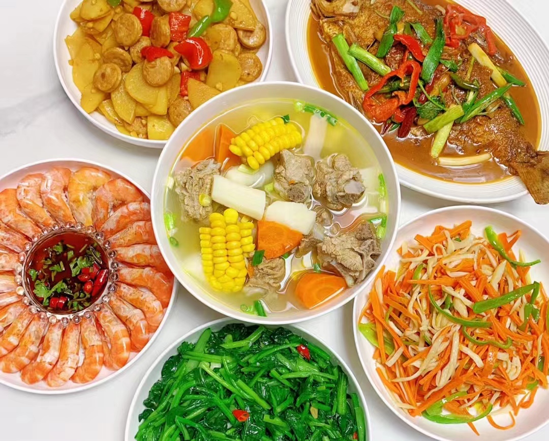 青豆虾仁,番茄牛腩,清炒素菜,酸辣莲藕,还有玉米排骨汤。