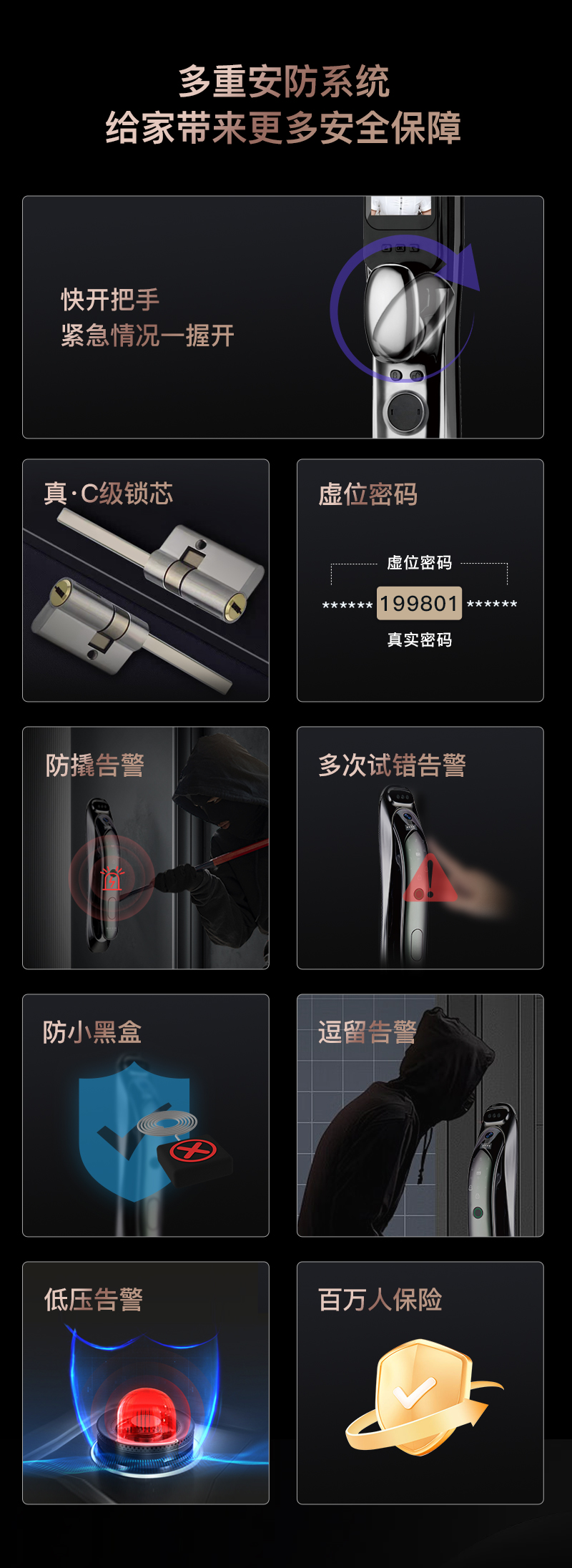 要点四:安全的延伸——主动智能的安防系统现代智能锁不仅是“锁”,更是一个“安防节点”。除了上述硬件安全,还应关注其智能防护功能:如防撬报警、多次试错锁定、虚位密码(可在正确密码前后任意输入数字防窥探),以及集成智能猫眼实现远程可视对讲、门前异常逗留抓拍告警等。