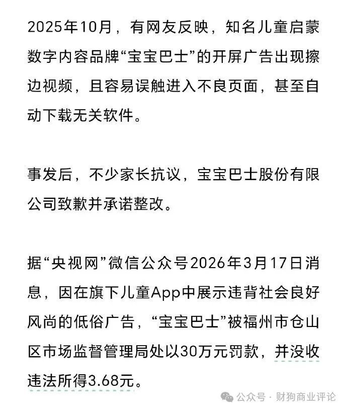 好在这次处罚力度够大,整改也算及时。希望宝宝巴士能吃一堑长一智,把那30万当成一笔昂贵的“学费”,以后在广告审核上多长点心。毕竟,赚那三块六毛八,真不够买速效救心丸的!