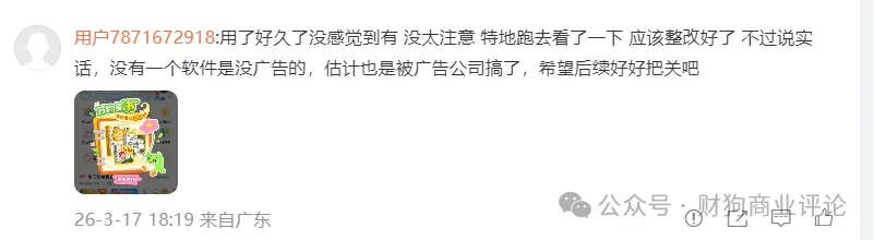 “用户7871672918”则显得比较佛系:“没有一个软件是没广告的,估计也是被广告公司搞了,希望后续好好把关吧。”