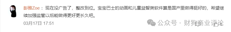 “彭雅Zoe”表示:“现在没广告了,整改到位。宝宝巴士的动画和儿童益智类软件算是国产里做得挺好的,希望继续加强监管以后能做得更好更长久吧。”