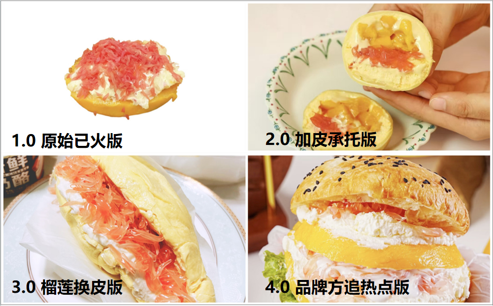 嗅到商机的商家们进一步将其产品化:把所有原料搅拌成馅、整体上再包一层糯米皮,固定形态的同时增加层次,做成类似雪媚娘的出品形态,这种吃法被定义为“2.0”版本。截止发稿,新迭代的版本出现了:用两瓣榴莲完成最终包裹,变身3.0版“榴莲汉堡包”!