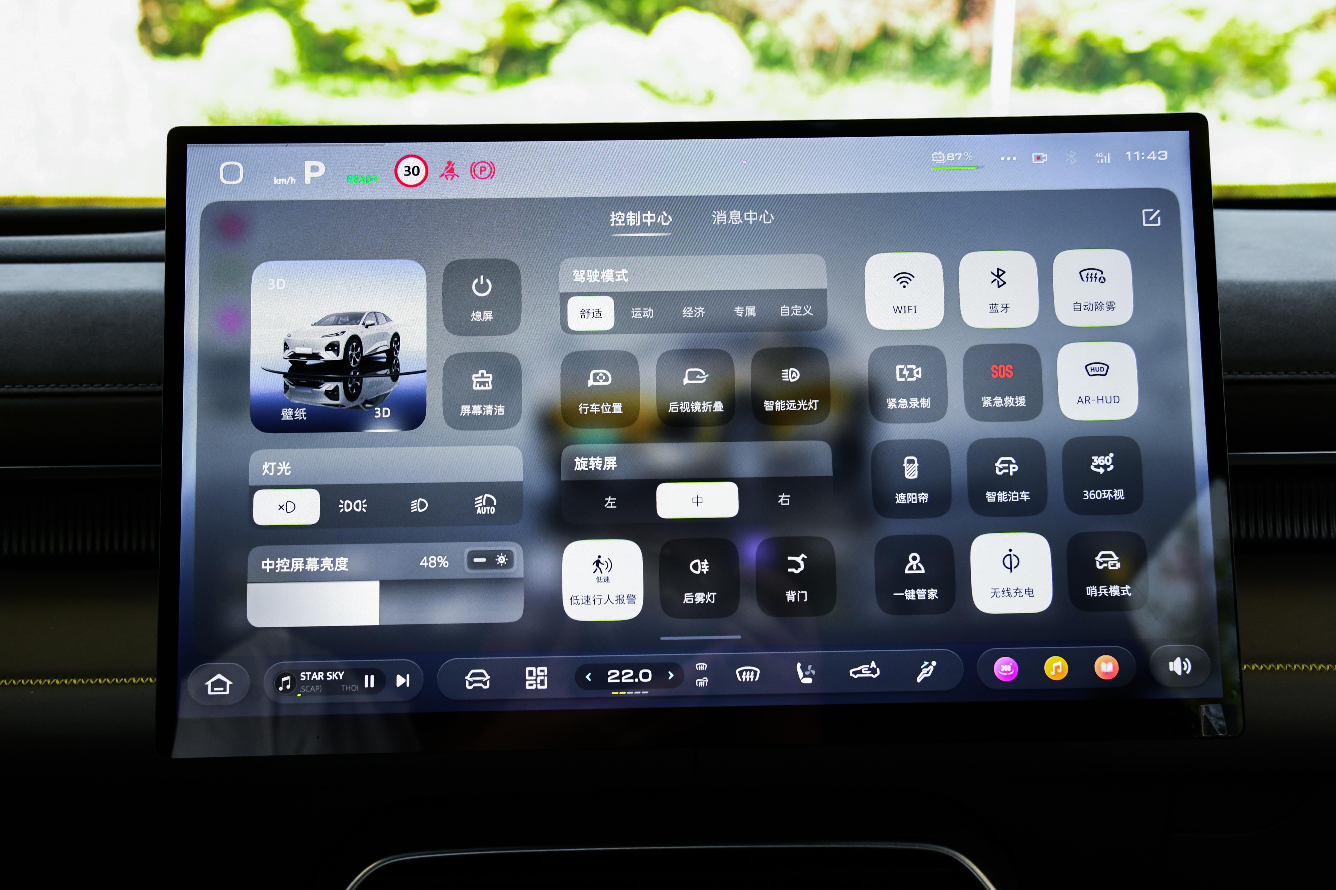 尤其引人注目的是那块15.6英寸的“向日葵”中控屏。它支持左右各15度的旋转,无论是主驾操作导航还是副驾娱乐观影,都能获得恰当的视角。传统的仪表盘被一块55英寸的AR-HUD抬头显示所取代,车速、导航等关键信息可以直接投射在前风挡上,驾驶时视线无需离开路面,提升了安全性。