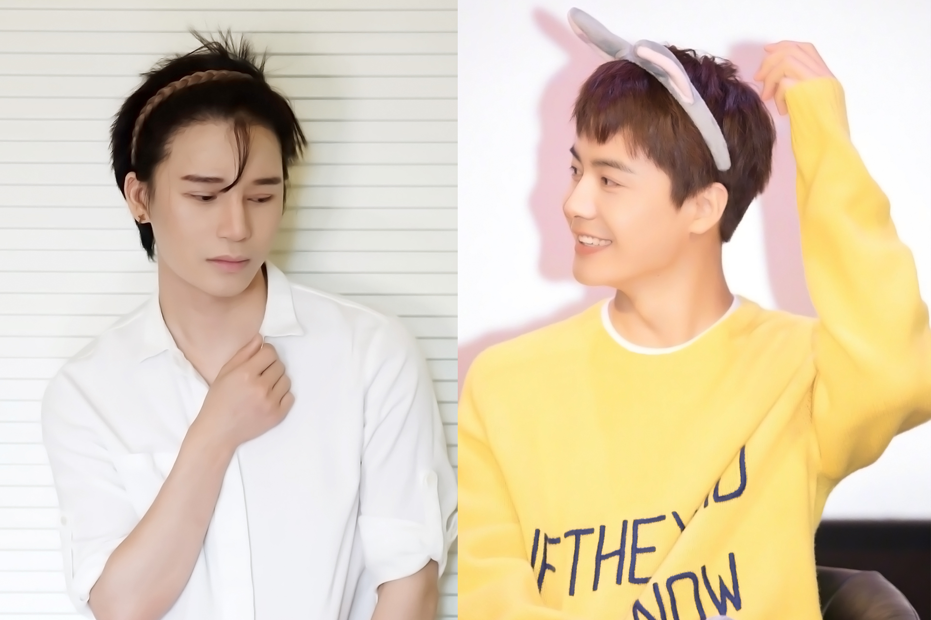 当发箍邂逅男星,竟碰撞出令人心动的化学反应。女生戴发箍是校园剧里的白月光,而男星戴发箍——尤其是马天宇与陈奕天这般眉眼含星的少年,则像夏日气泡水里突然蹦跳出的薄荷糖,清新得让人眼前一亮。镜头前的马天宇,头顶一对兔耳发箍,蓬松的弧度仿佛能兜住整个春天的软糯。暖黄色毛衣将他烘托成午后阳光里的慵懒猫崽,发箍丝带随风轻晃时,连空气都跟着泛起甜味。而陈奕天则把心机藏在细节里:假发发箍如藤蔓缠绕发丝,与冷白衬衫构成水墨画般的留白,他垂眸浅笑的模样,恰似古风漫画中走出的执笔公子。