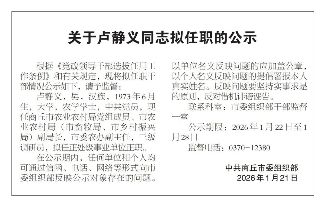 卢静义,男,汉族,1973年6月生,大学,农学学士,中共党员,现任商丘市农业农村局党组成员、市农业农村局(市畜牧局、市乡村振兴局)副局长,市委农办副主任,三级调研员,拟任正处级事业单位正职。