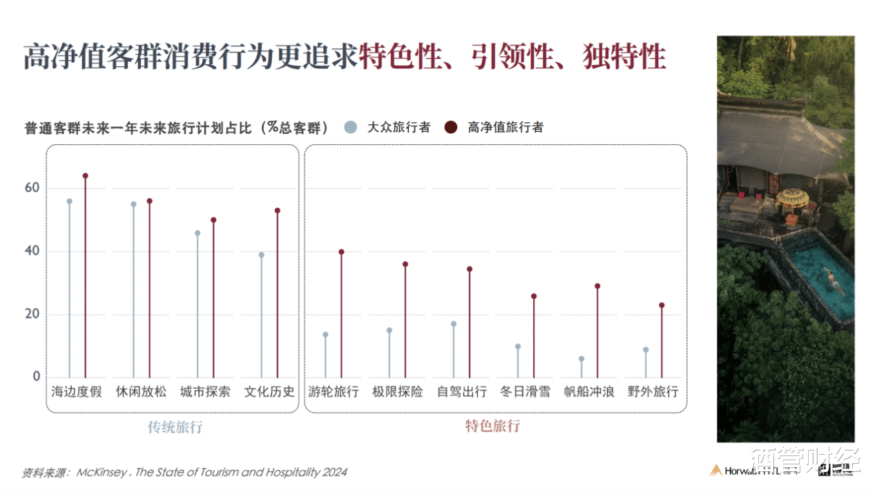 麦肯锡2024年《Updating perceptions about today’s luxury traveler》报告指出,净资产在10万至100万美元的客群已占据奢旅市场的35%,他们的核心需求是新奇感、文化历史感、真实体验,而非单纯的标准化高端设施。