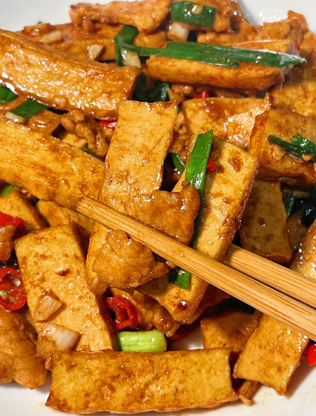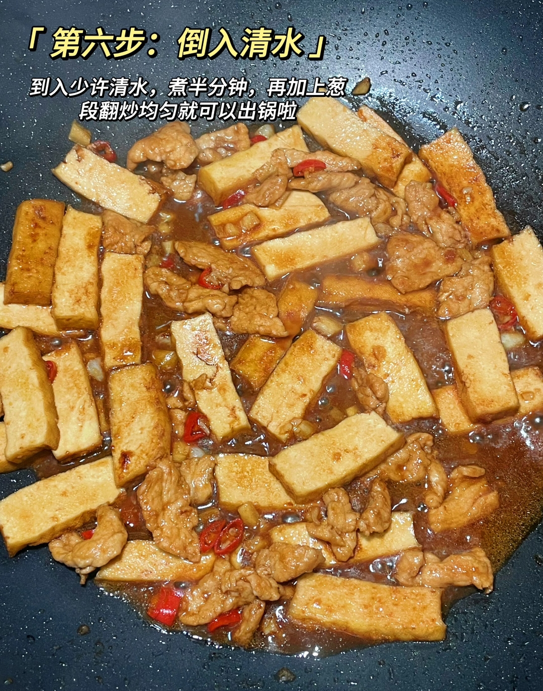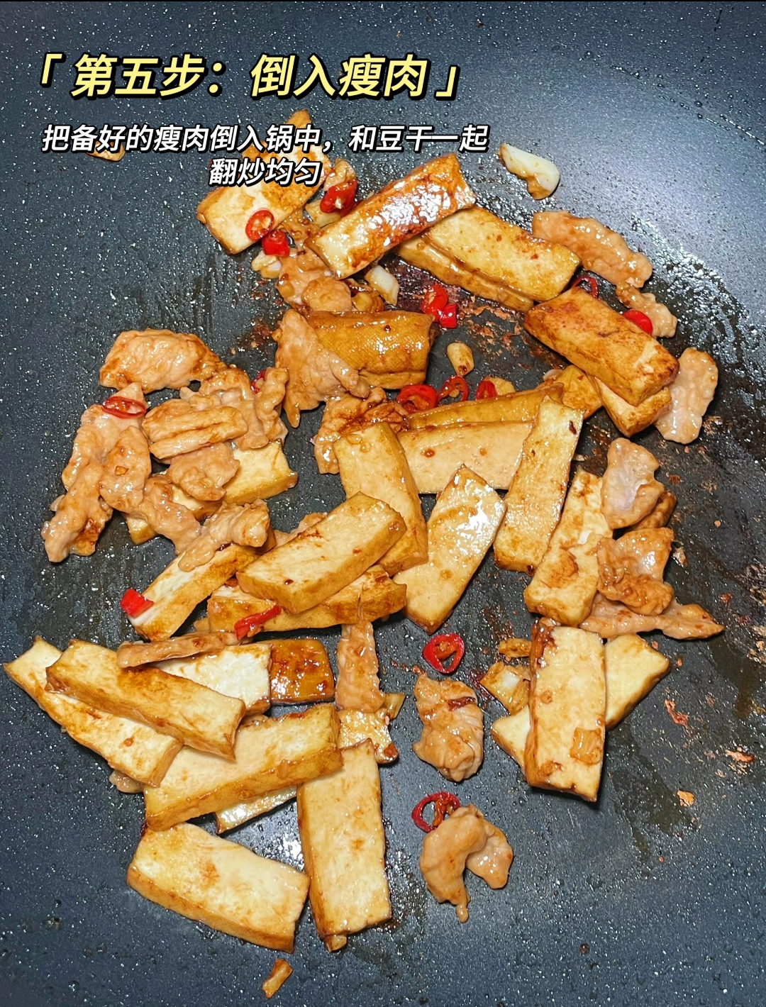 最后便是“合二为一”的高潮时刻。将先前滑好的瘦肉倒回锅中,与香干一同翻滚。此时淋入少许清水,这看似不起眼的一步实则是点睛之笔——半分钟的焖煮,不仅能让肉片回软,更能让香干与肉片的滋味在蒸汽中相互渗透,达到“你中有我,我中有你”的境界。出锅前撒上一把翠绿的葱段,快速翻炒两下,葱香在余温中释放,整道菜色泽红亮诱人,香气扑鼻。端上桌来,香干软糯弹牙,肉片滑嫩多汁,舀上一勺盖在热气腾腾的白米饭上,便是最踏实的人间烟火气。