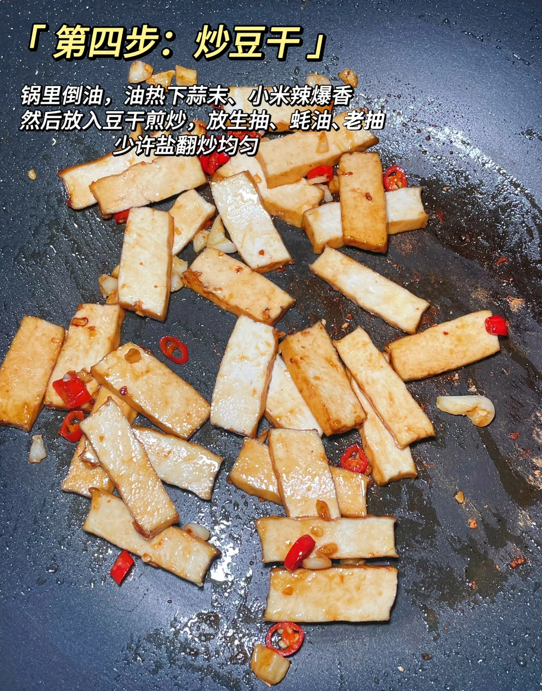 锅中留底油,重新加热后投入蒜末与小米辣,辛辣的气息瞬间弥漫开来,为整道菜奠定了浓郁基调。随后将切好的香干倒入,中小火煎炒是关键。香干质地紧密,需要耐心煸炒,待其表面微微起泡、边缘略带焦黄,豆香味才会被彻底激发。此时进行调味,生抽提鲜、蚝油增厚、少许老抽加深色泽,再加一点点盐,翻炒均匀让香干充分吸收调料精华。