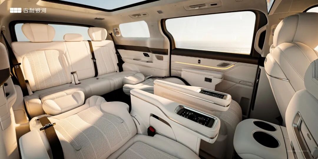 在舒适体验上,吉利银河V900将豪华融入每一个细节。吉利银河V900云感SPA座椅支持加热、通风、记忆及SPA级按摩功能,久坐不累。27扬声器Flyme Sound无界之声系统,配合后排娱乐巨幕,打造沉浸式移动影音厅,告别长途沉闷。此外,-6℃~50℃超宽温域冷暖箱、二排双模小桌板等贴心配置,无论是冷饮保鲜、热汤保温,还是移动办公、亲子学习,皆能轻松应对,舒享满分。