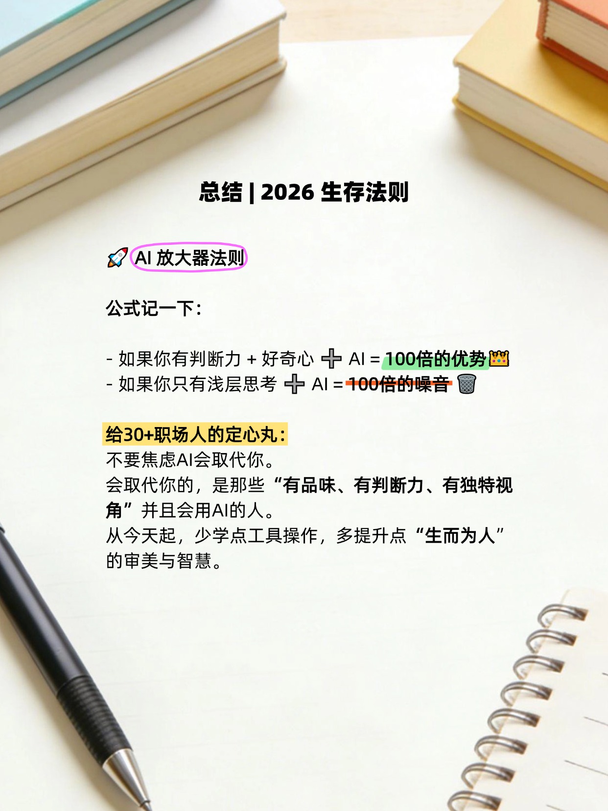 💡 一句话总结:AI 让浅薄的人制造更多噪音,让深刻的人拥有百倍杠杆。 2026年,别做工具人,做那个“有品味的指挥官”。