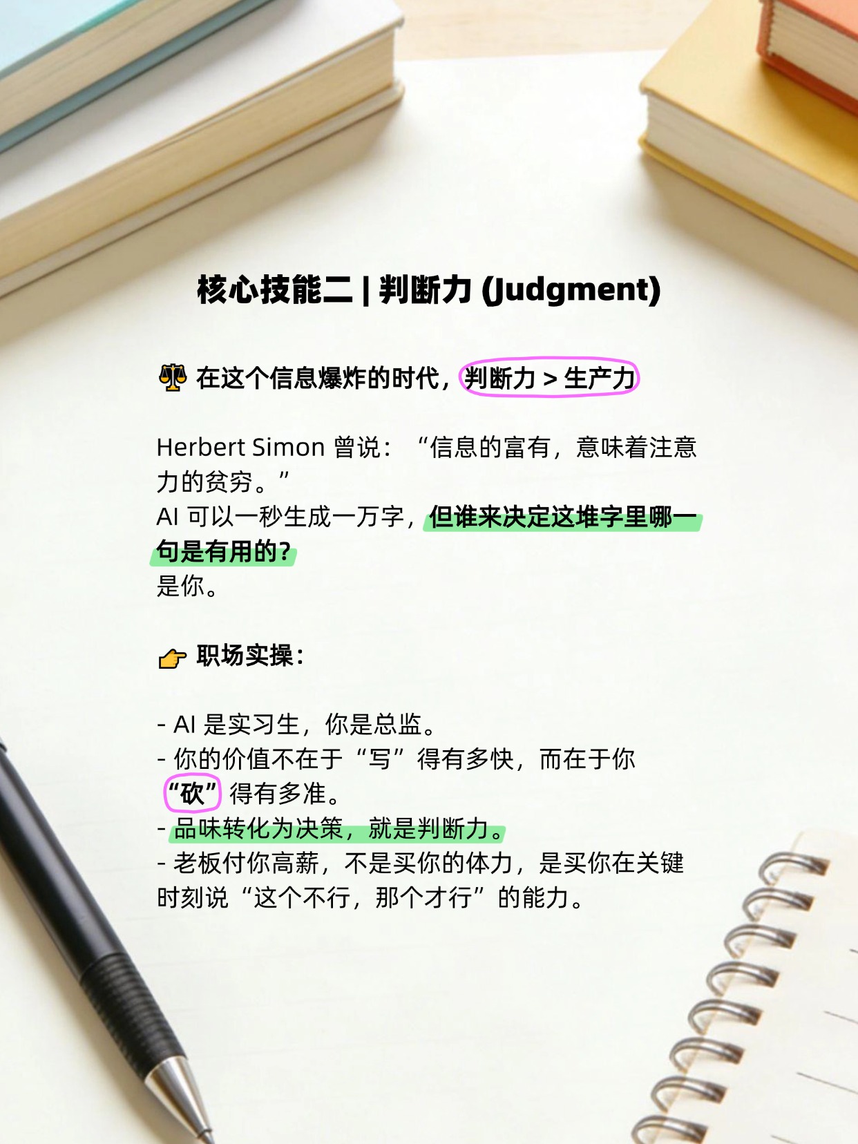 2️⃣ 判断力 (Judgment):信息越泛滥,筛选信息的能力越值钱。AI负责生产,你负责决策。