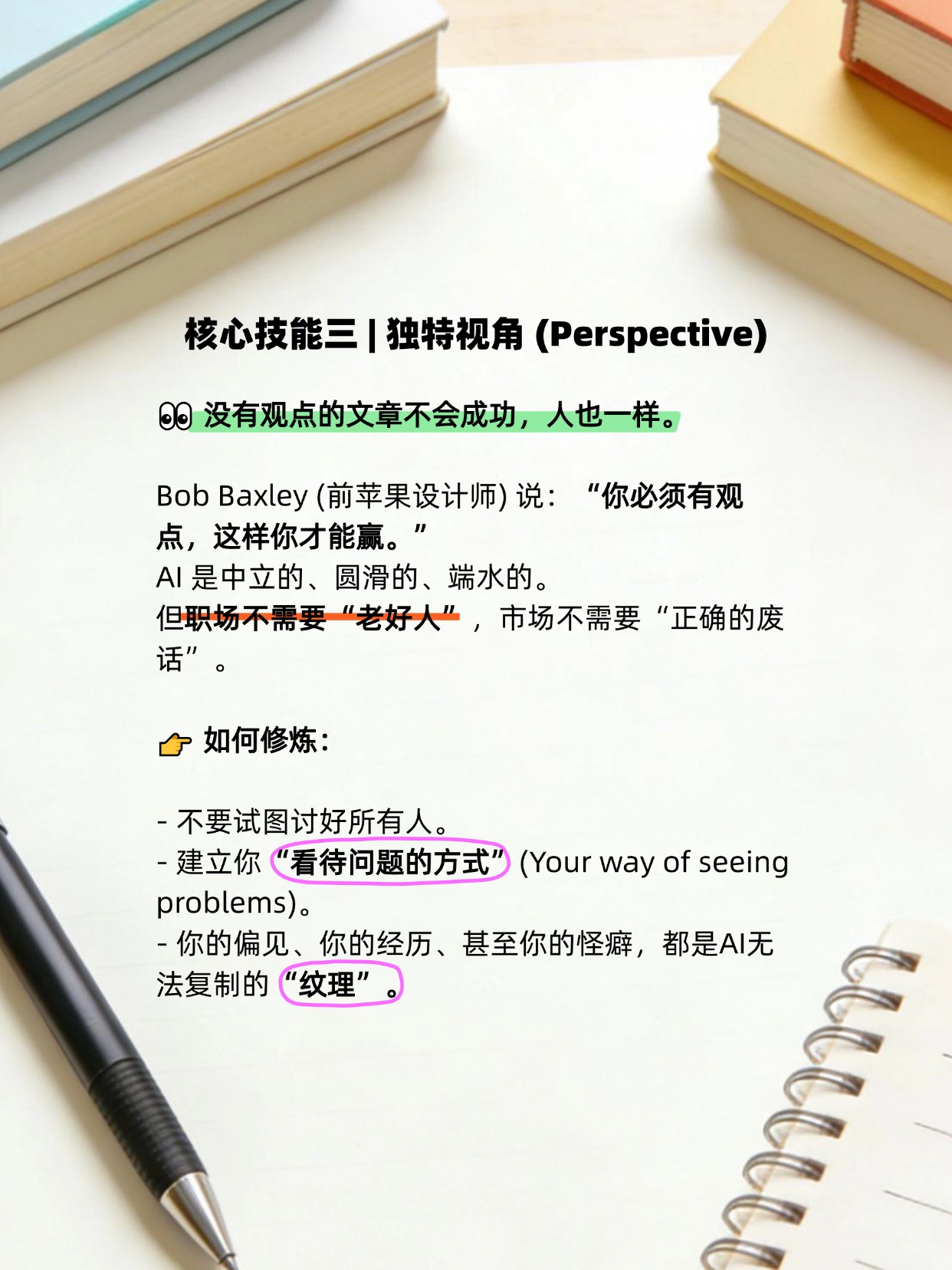 3️⃣ 独特视角 (Perspective):不要做中立的复读机。要有观点,要有态度,要有你自己的“棱角”。