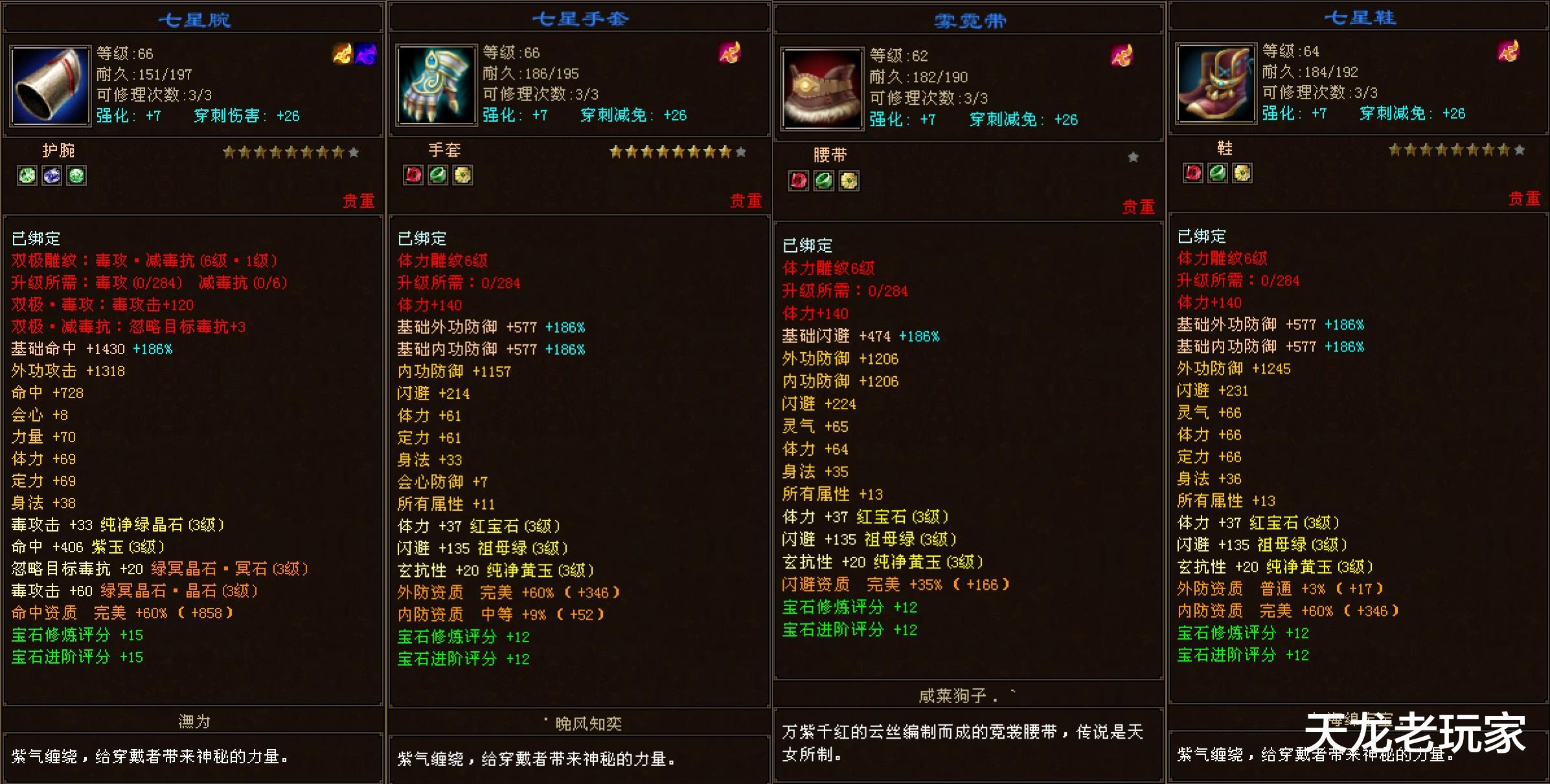 虽然是3级号,但是人家装备真的件件严选!防具清一色带闪避、体力、身法、所有属性!甚至手套还是全属性的!