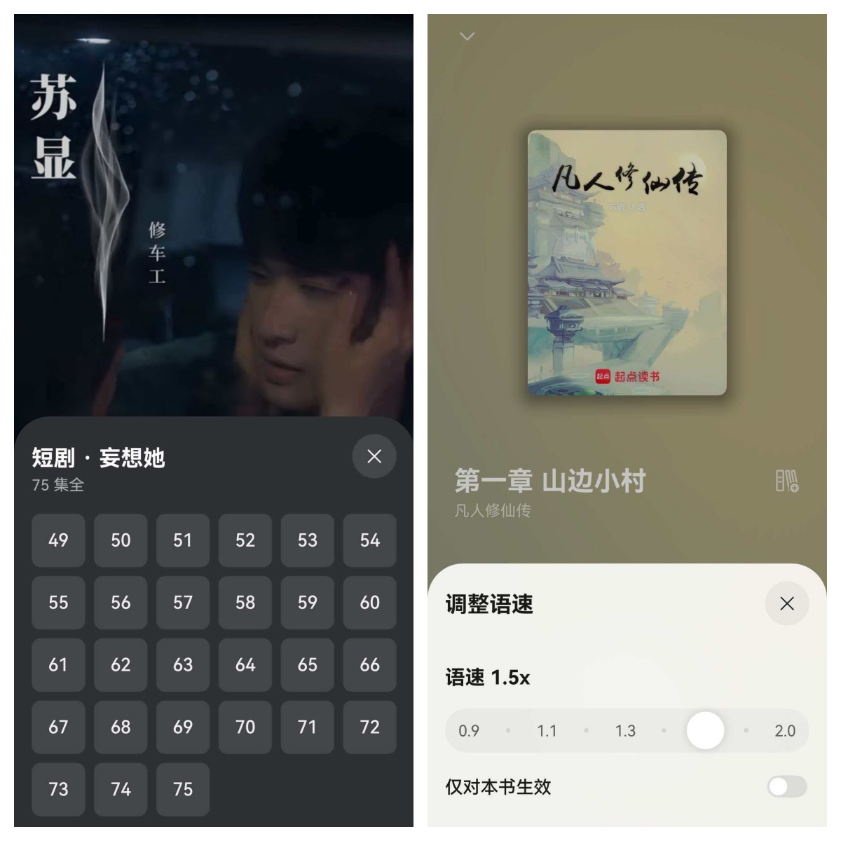 小说频道也是同理,不仅全免费,那个“听书”功能更是神来之笔,0.9到2.0倍速随心调,还有8款音色适配不同题材,睡前定个时,听着听着就沉浸到小说的世界里。
