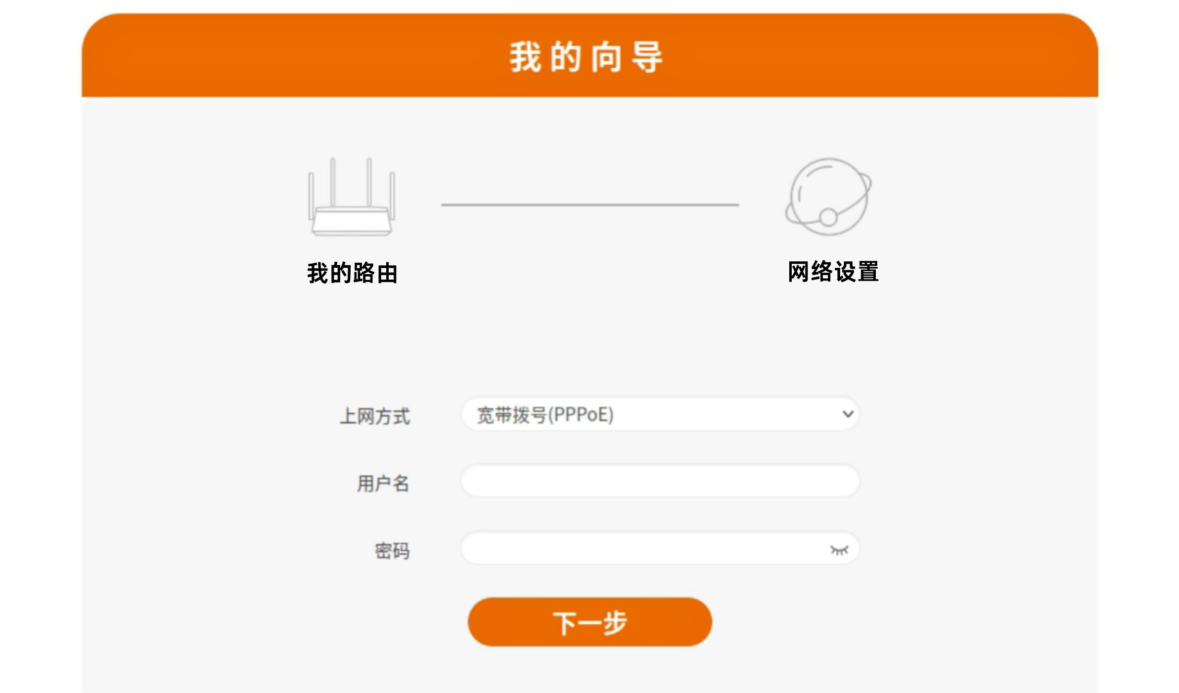 登录后按照指引完成相关设置,一般家用网络上网方式选择“PPPOE”,输入运营商提供的宽带信息。