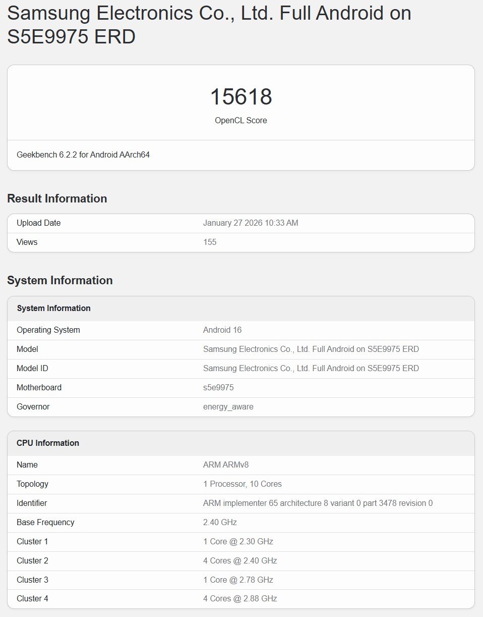 当大家还在猜测Exynos 2600的跑分表现时,三星的下一代旗舰芯片Exynos 2700已经悄悄在Geekbench 6上露了个脸。这波操作真是让人猝不及防——毕竟前代产品还没正式亮相,后继者就已经开始刷存在感了。