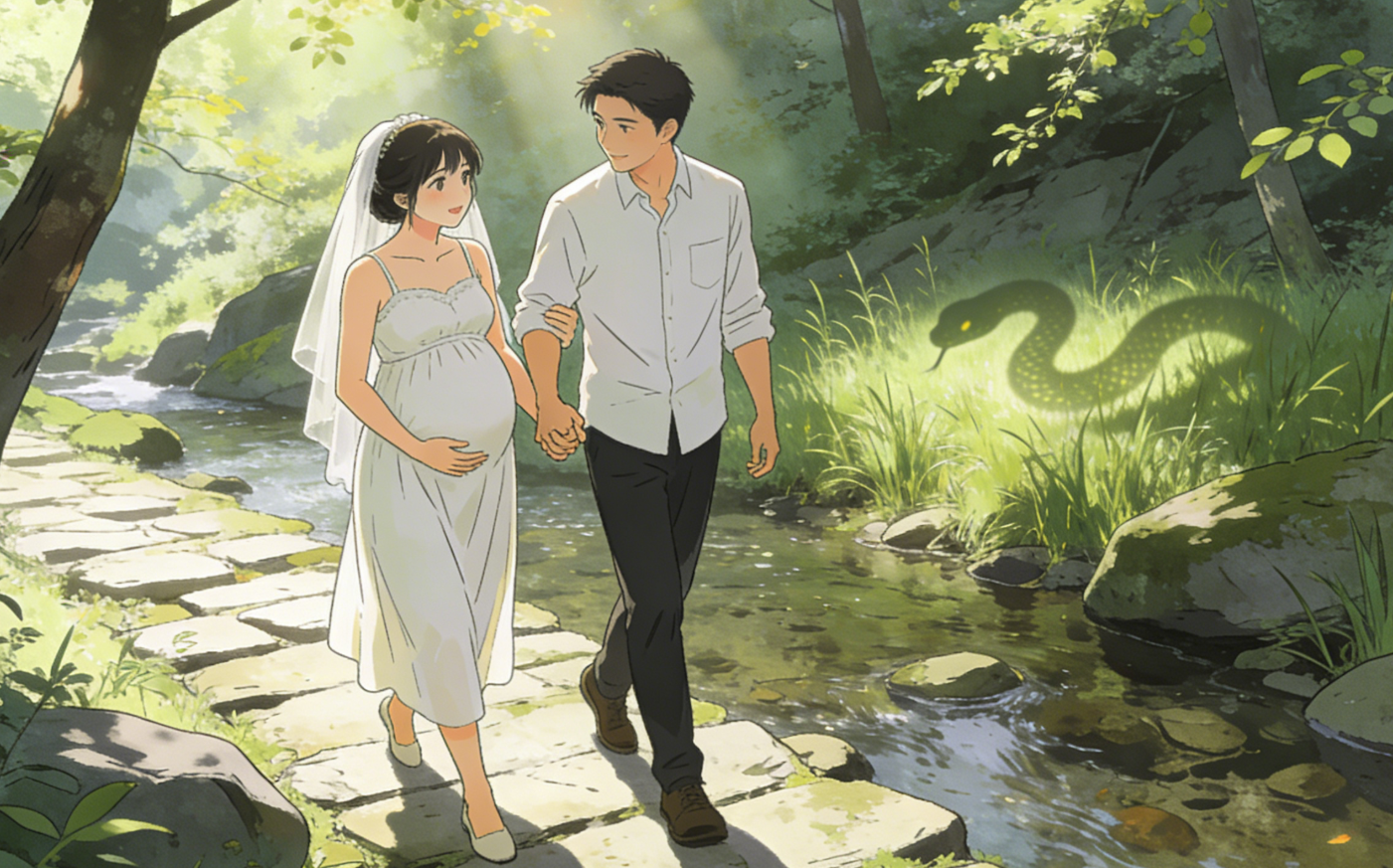 话说有这么一对小夫妻,新婚燕尔,媳妇儿呢,怀着头胎,有七个月了。小两口感情好,就想着上山去转转,看看风景。这怀孕的人呐,身子重,有些地方、有些讲究,现在年轻人懂得不多了。他俩高高兴兴在山里逛啊,走啊,不知不觉,就走进了一个“地界”。啥地界呢?据说是山里修行年头很久的“蛇仙”的地盘。他俩不知道啊,这算是一家三口都进去了——媳妇肚子里还带着一个呢。
